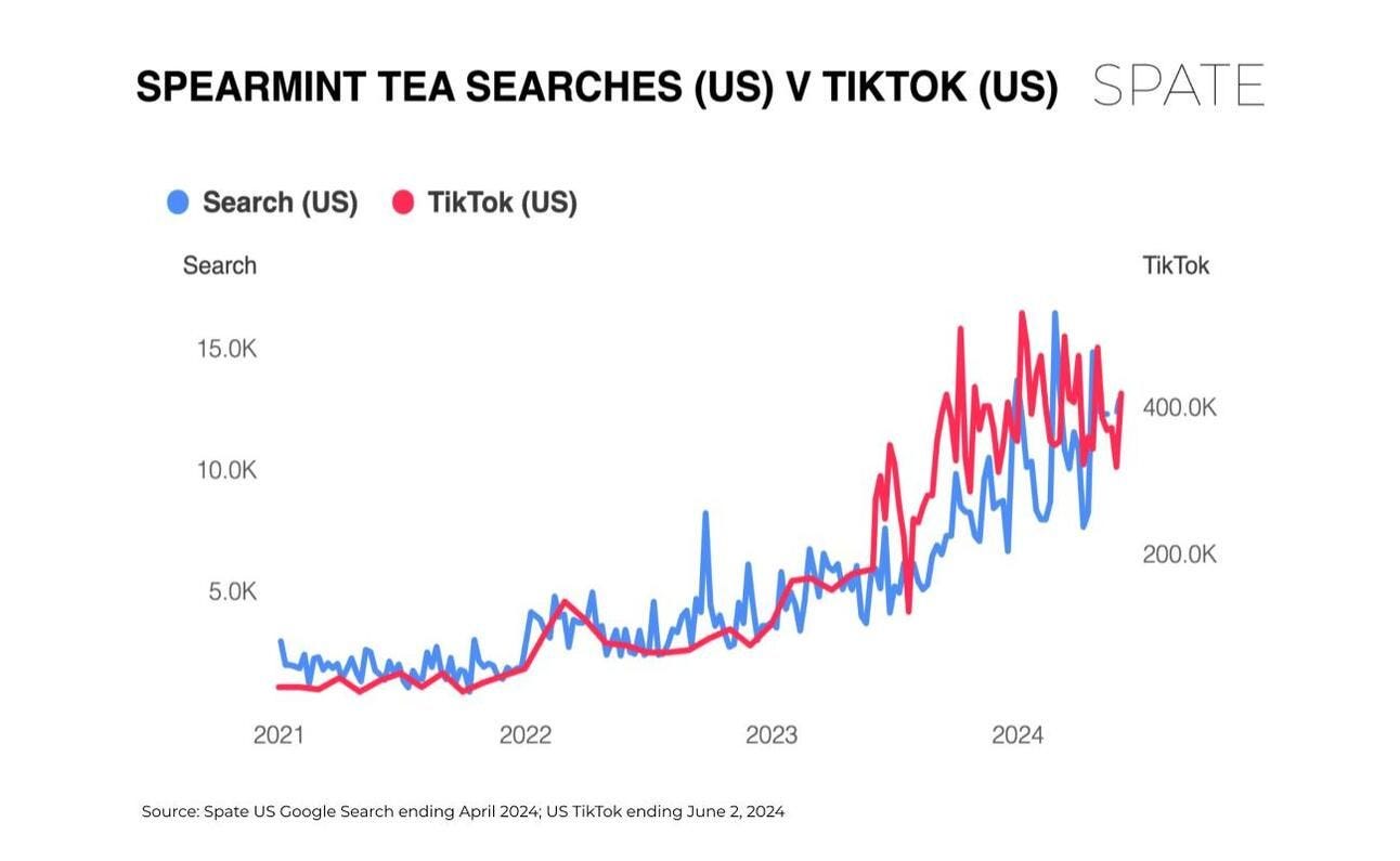 Spearmint tea is considered a high awareness trend on Google Search, with an average of 48.6K searches per month. Since last year, searches for the tea have grown +97.8% on TikTok. The top-searched concerns are pregnancy (as in “Is spearmint tea safe during pregnancy”) and hormonal acne (ie, “Spearmint tea for hormonal acne”). Tea companies rise up. This one’s a trend for you.