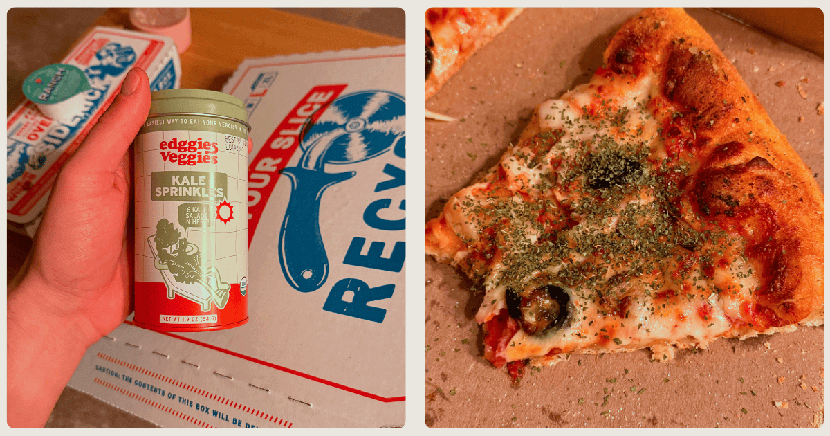 You know what boy math is? It’s putting kale sprinkles on your pizza. Edggies Veggies is one of the funnest new brands I’ve come across lately. I love the simplicity and innovative nature of the product. Plus more greens in your diet is good.