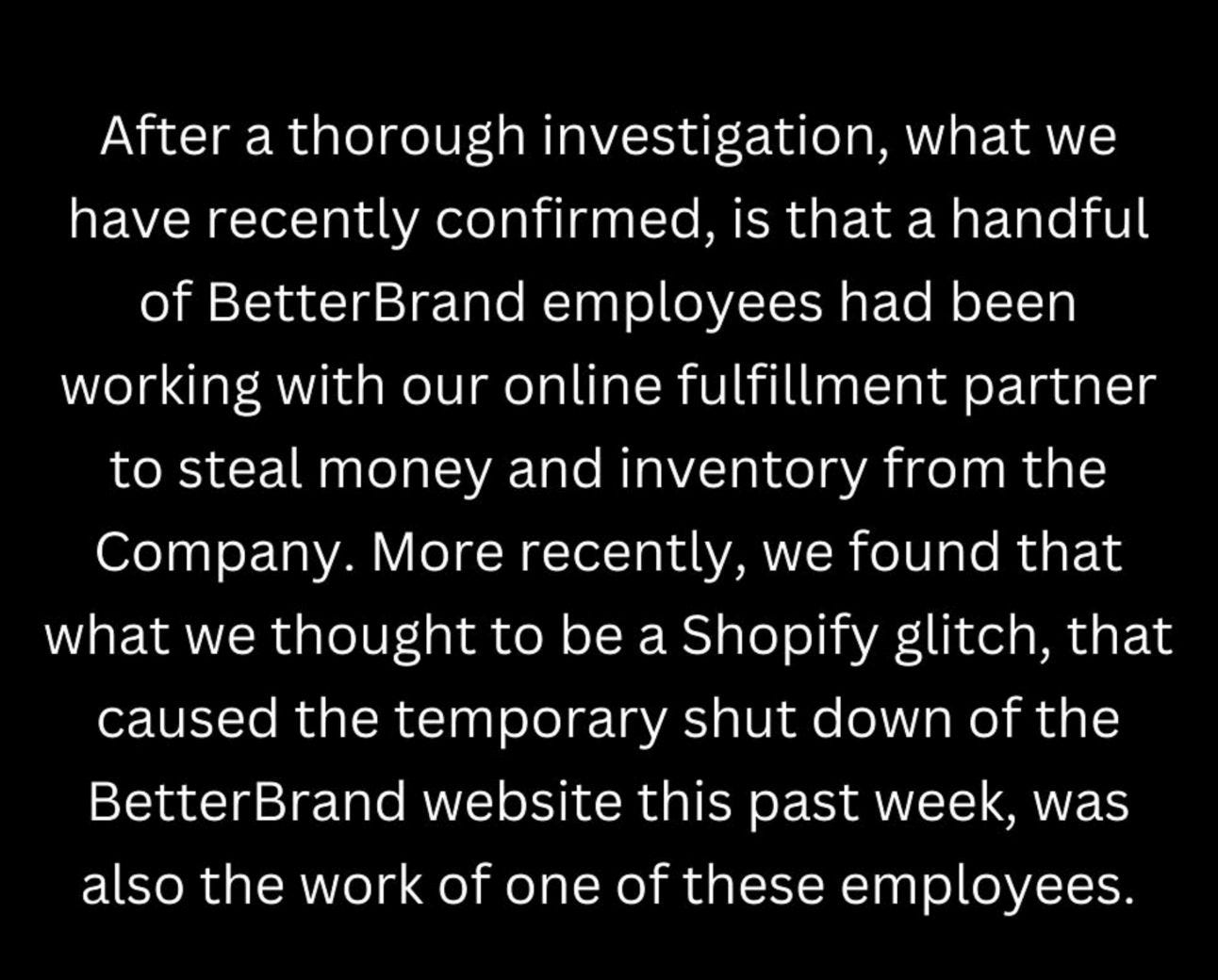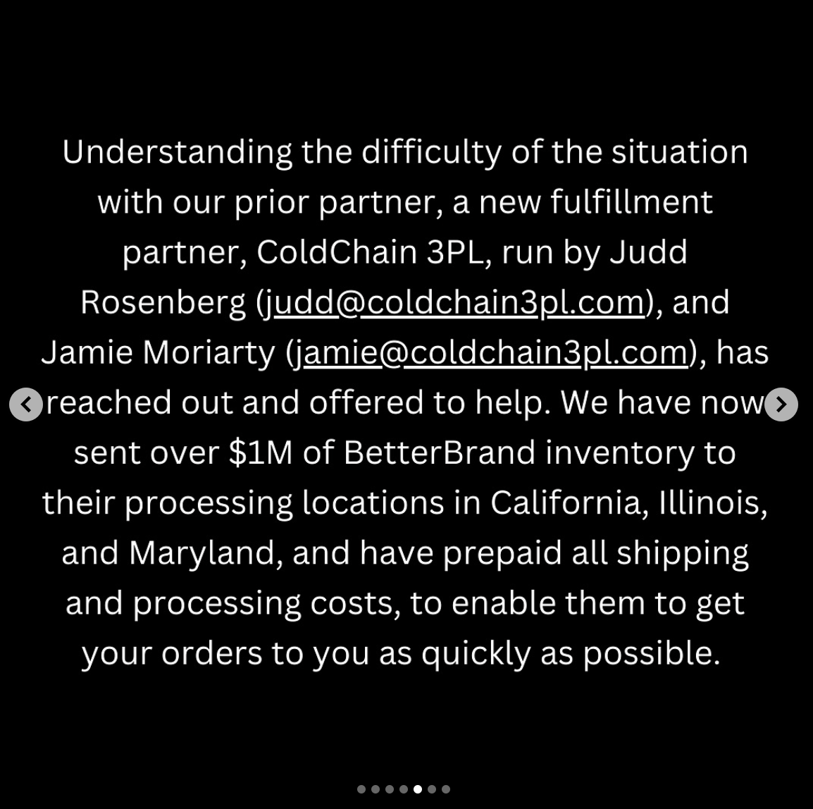 A few days pass and the founder and brand break their silence to share their side of the story, claiming a few rogue employees were supposedly stealing from the company. But they provided some hope. Apparently, their “new” 3PL partners would swoop in to save the day: