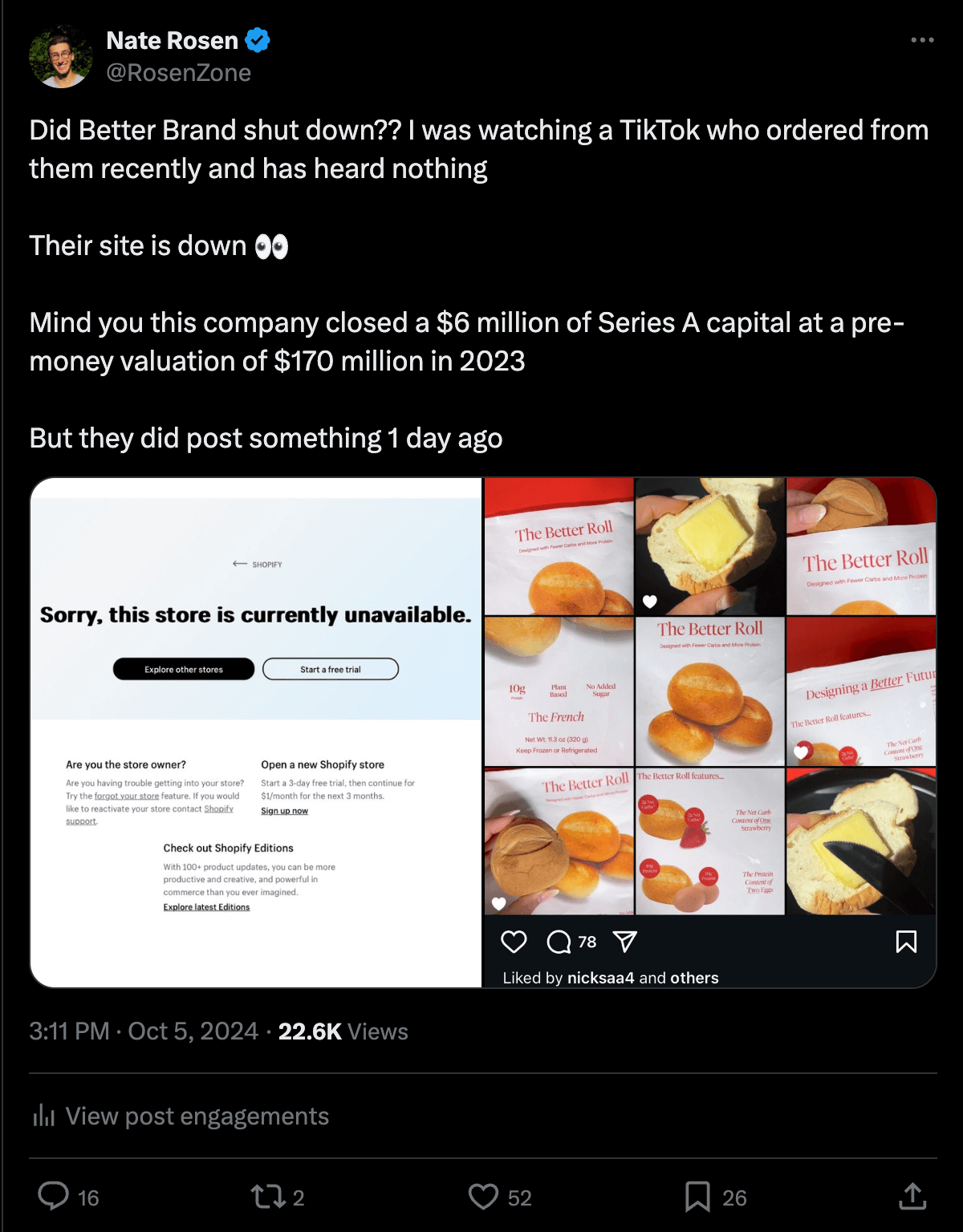A TikToker (@kelly_morrow) posted a video about how she ordered a Better Bagel over a month ago and hadn’t heard from the company. So she went to the website…only to find that the site was down and the brand wasn’t answering emails.