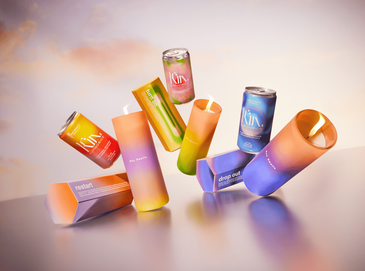 Bella Hadid's Kin Euphorics has partnered with Boy Smells candles to launch three new candles, each with a recommended Kin Euphorics flavor pairing to be sipped on while the candles burn. (source)