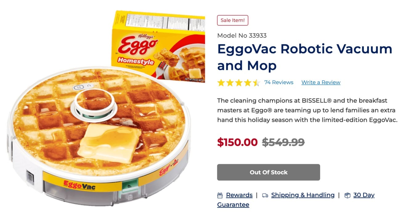 Eggo and BISSELL have collaborated to create the EggoVac, a limited-edition waffle-inspired robotic vacuum designed to simplify parents' to-do lists during the busy holiday season. (source)