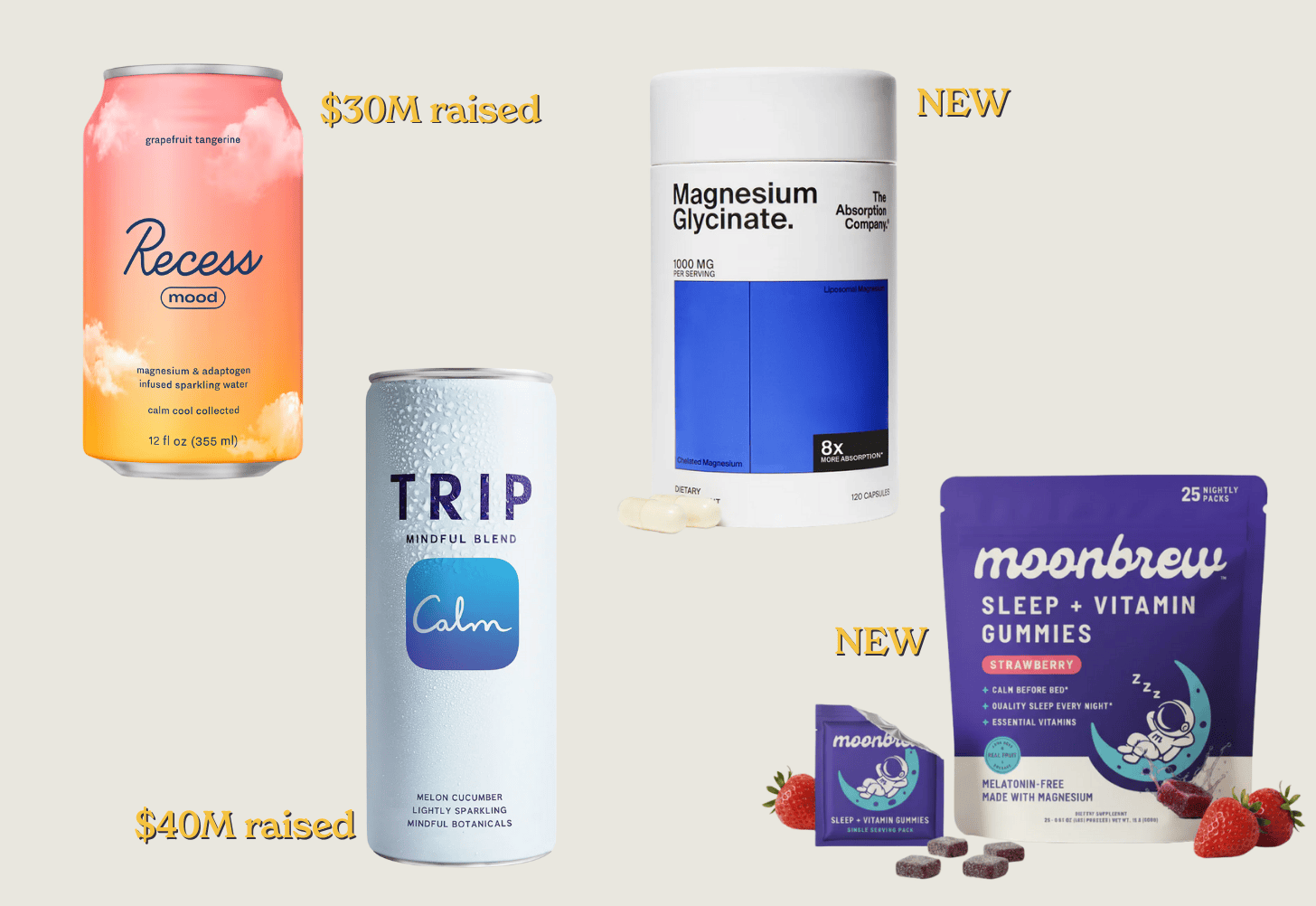 As a result, VC money is pouring in. Recess, which launched in 2018 as a CBD beverage, announced that 95%+ of its sales now come from its magnesium-based Recess Mood line. The brand’s $30M raise brought in CAVU’s Jared Jacobs, who explained the thesis: “There’s a $25 billion-plus energy drink market in the U.S. built on stimulation, and we believe there needs to be a counterweight built on relaxation.
