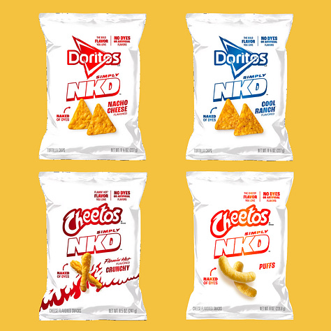 Birthday suit or bust. PepsiCo launched Simply NKD™, Doritos and Cheetos without artificial flavors or dyes—completely colorless, but apparently, same taste. Available December 1, the line includes Nacho Cheese, Cool Ranch, Puffs, and Flamin’ Hot varieties.