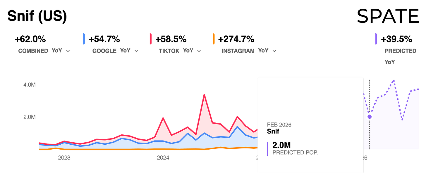 This creates the perfect storm for brands in the under-$100 space. Snif’s fragrances are priced at $65, while brands like Dedcool ($90), Noyz ($85), and Lore ($88) are all carving out space in what’s being called the “masstige” segment (mass + prestige).