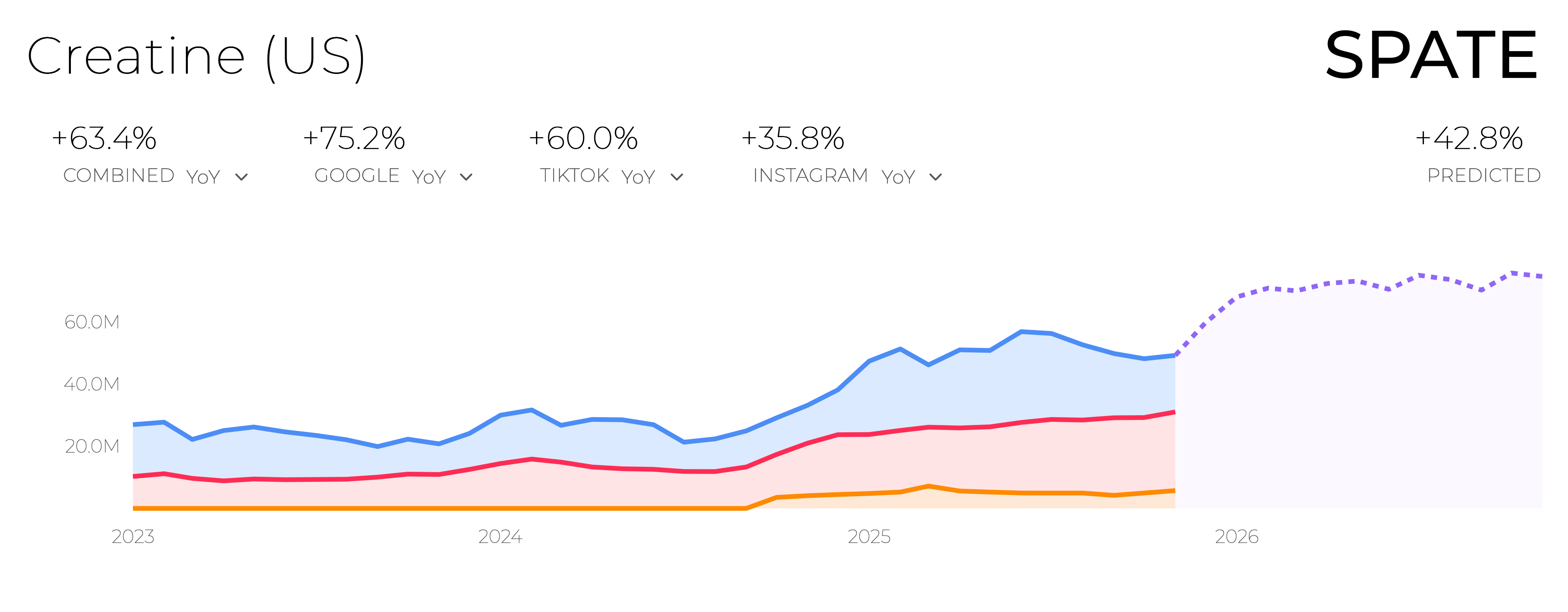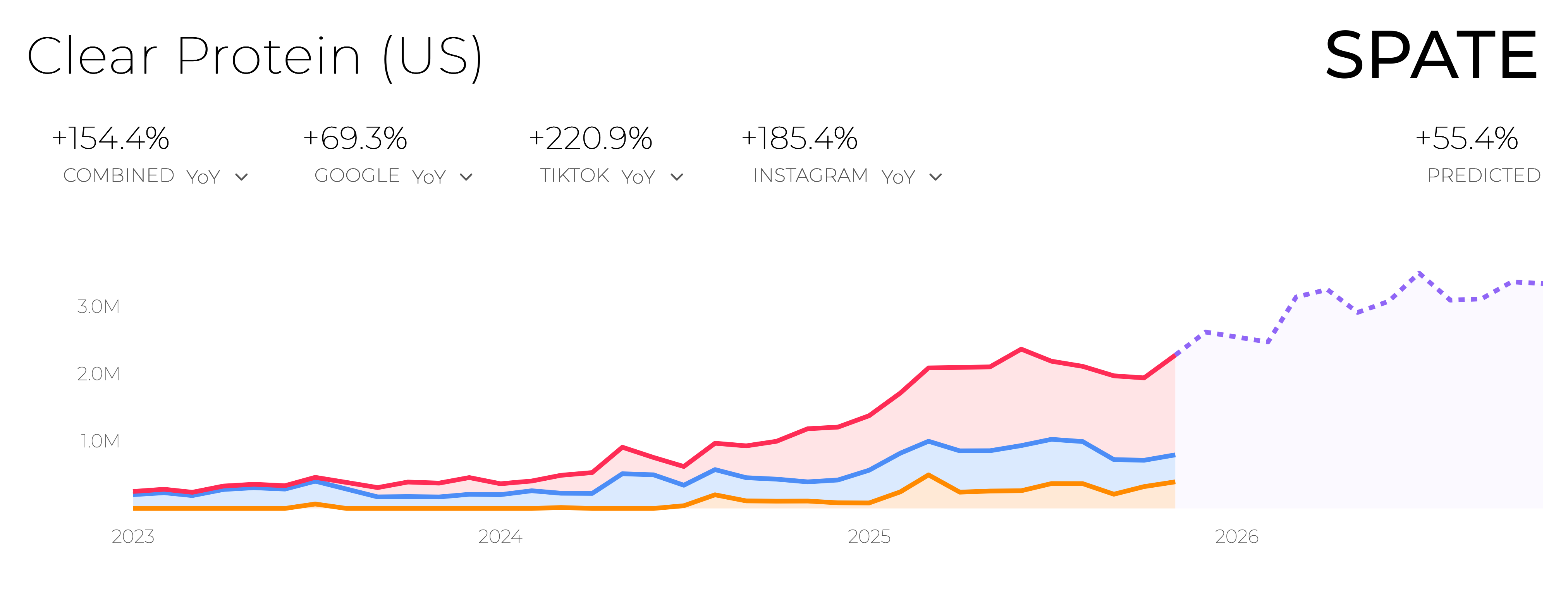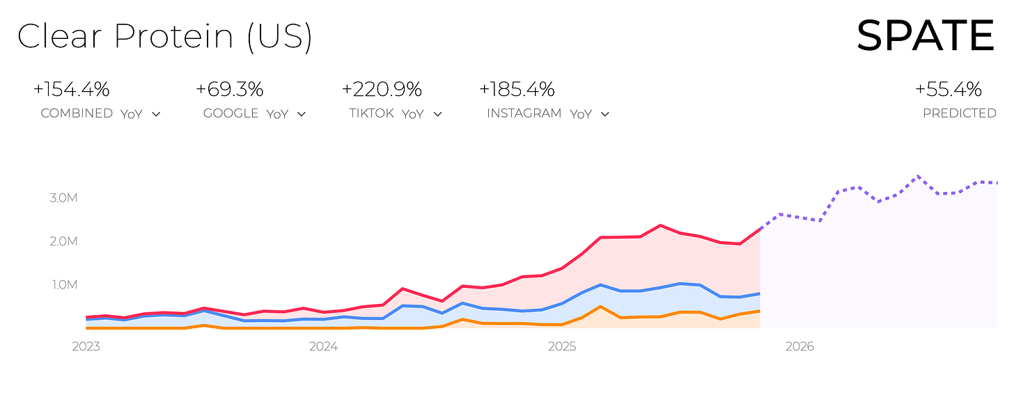 Year-over-year demand for clear protein has surged across Google, TikTok, and Instagram, and search trends predict continued growth over the next few years. As consumers look for more approachable, less “chalky” protein options, clear formats are filling that gap: