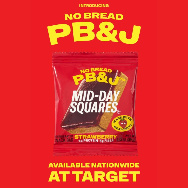 PB&J sans bread. Mid-Day Squares, makers of refrigerated functional chocolate bars, have launched their first non-chocolate product, the No Bread PB&J bar, available nationwide at Target.