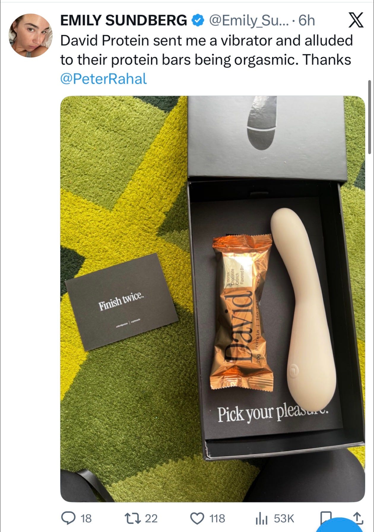 While we shouldn’t be surprised by the sheer audacity of this brand—might we remind you about the cod of it all—this does feel especially unabashed and weirdly gendered. The OG bar, which features 8g more protein, was marketed more towards men. Meanwhile, this lower-protein, more indulgence-oriented bar is quite literally being shilled out with vibrators and claiming equal opportunity pleasure. I could write a thesis on this launch, and its inherent connections to GLP-1s and sexualization of ever-skinnier bodies, how the “wellness” world is weaponizing shame, and more, but for now, I’ll leave you with this… (shoutout Emily Sundberg for sharing) - Jenna