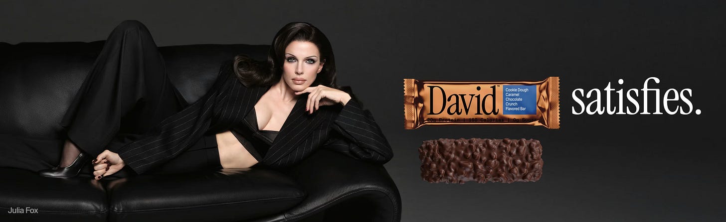 The product itself feels fairly standard and, frankly, extremely similar to beloved Barebells. But what waswild about this was the brand’s launch strategy. David partnered with the incomporable Julia Fox for a full campaign and video in which she shares (in a literal confessional booth) that she’s regretful, hungry for more, perhaps even aroused… but she swore off men. It’s then revealed that the “David” she’s seduced by is actually a protein bar, which doesn’t make her choose between her macro goals and satisfying her sweet tooth. If you haven’t heard, sex sells—and evidently, in the year of our lord 2026, the David team is shamelessly embracing that fact.