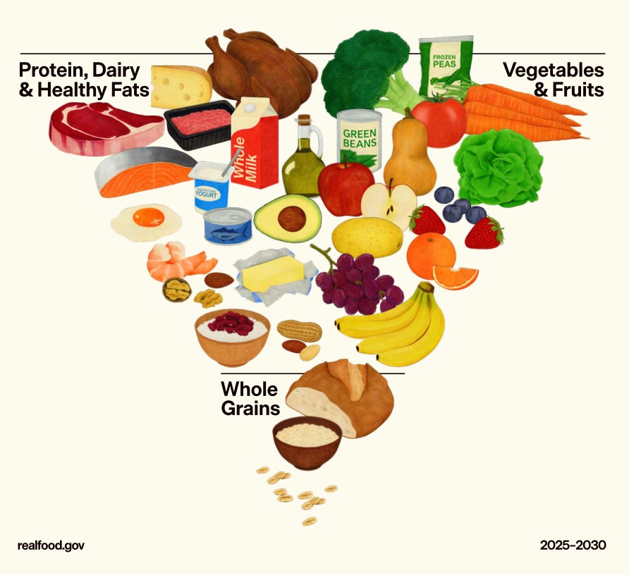 The new guidelines directly contradict their own scientific advisory panel, which recommended listing plant proteins ahead of meat because Americans don’t get enough fiber and could benefit from eating more beans and lentils. The inverted pyramid doesn’t even reflect the actual quantities recommended in the text—it’s more of a political statement than useful nutrition guidance if we’re being honest. Plus, the pyramid is genuinely confusing to read. The whole thing reads less like evidence-based policy, and more like MAHA vibes packaged as scientific fact. There’s a lot to say on this, most of which other people have said better than us (some fave creators/thinkers: Elly Truesdell, Jessica Knurick, PhD, RDN, and our fave food scientist, Hydroxide), but at the end of the day, most Americans ignore federal nutrition advice anyway. 🤷