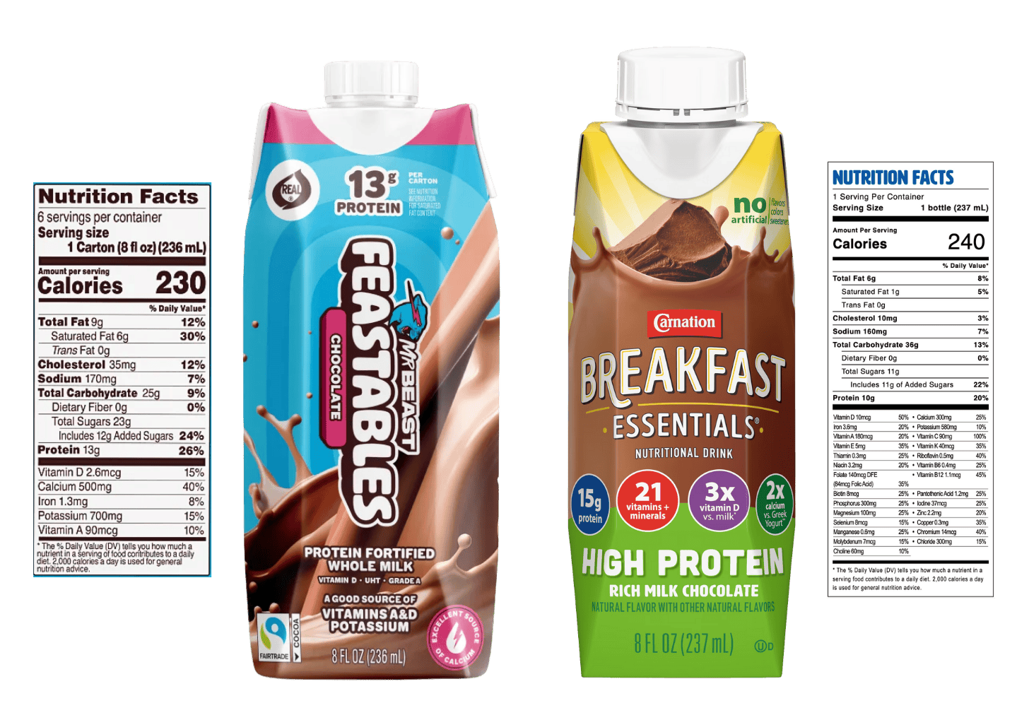 MrBeast goes beyond the bar. Feastables launched Protein Fortified Whole Milk, with 13g of protein alongside a hefty 23g of sugar per serving. Based on its nutritional profile (ignoring the sugar), it bears a striking resemblance to Carnation Breakfast Essentials shakes.
