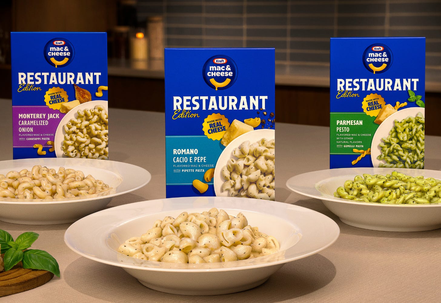 The blue box is sweating. Kraft Mac & Cheese is rolling out its new âRestaurant Edition,â a supposed elevatedline featuring three flavors: Parmesan Pesto, Romano Cacio e Pepe, and Monterey Jack Caramelized Onion.