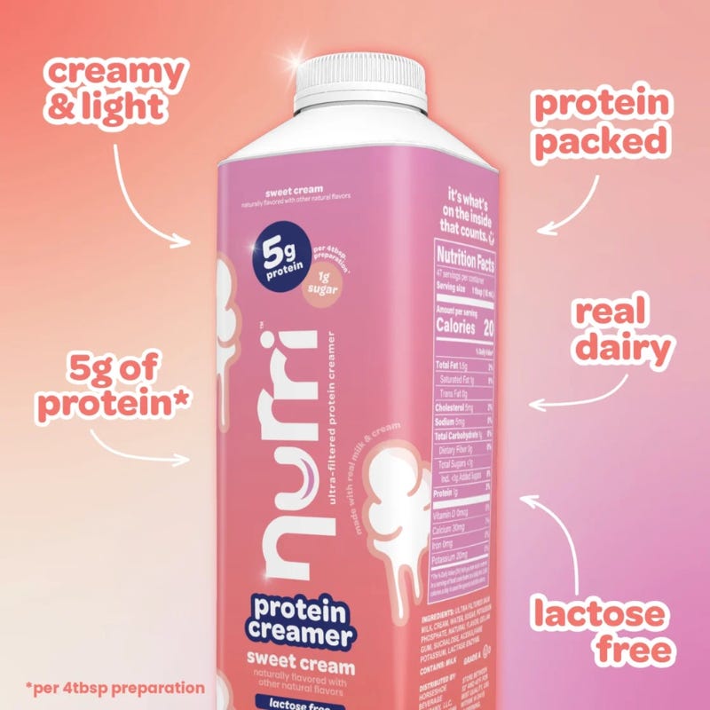The at-home barista trend gets its protein match. Nurri, a protein drink brand known for its canned ultra-filtered protein milks, is launching protein creamers exclusively at Walmart. The new line includes three flavors: Sweet Cream, Salted Caramel, and Chocolate.