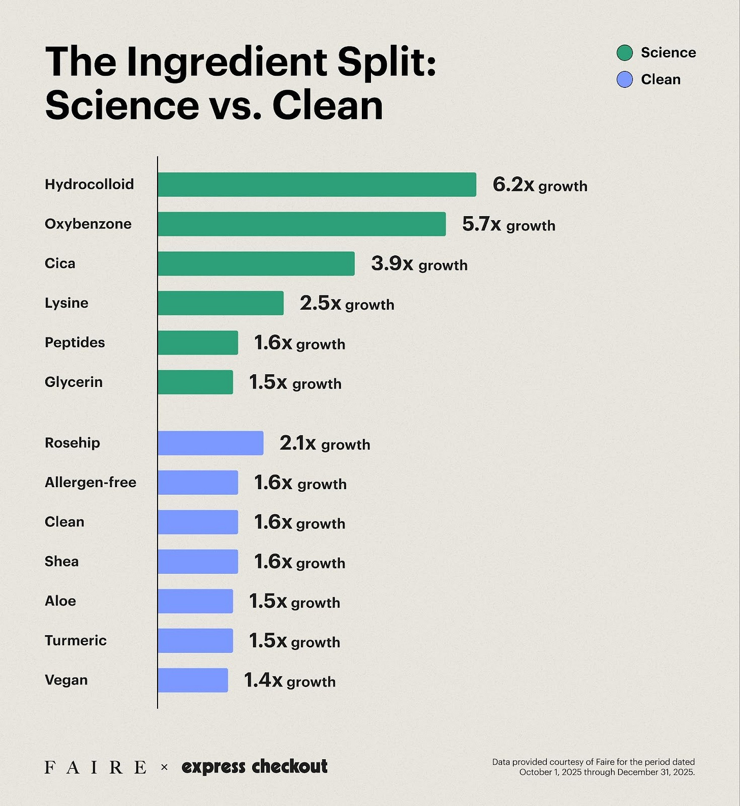 Looking at growth ratios for ingredients on Faire, a pattern emerges. Some of the fastest-growing items are unambiguously science-forward:
